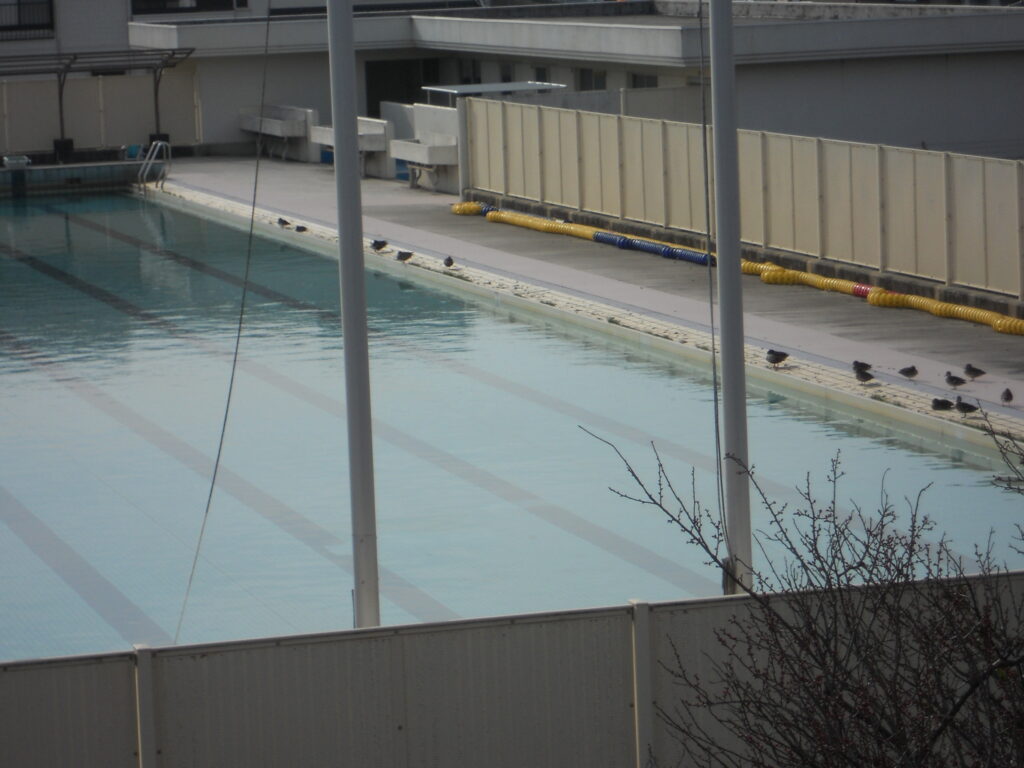 しかし、さすがに冬期は使用することができないので、誰も来ません。このため、今の時期は、毎年野鳥の楽園となっています。餌があるはずがないのになぜか野鳥が寄ってきてプールサイドで日向ぼっこをしたりプールで泳いだりしています。そして、その様子を2階から見ているとなぜか癒されます。